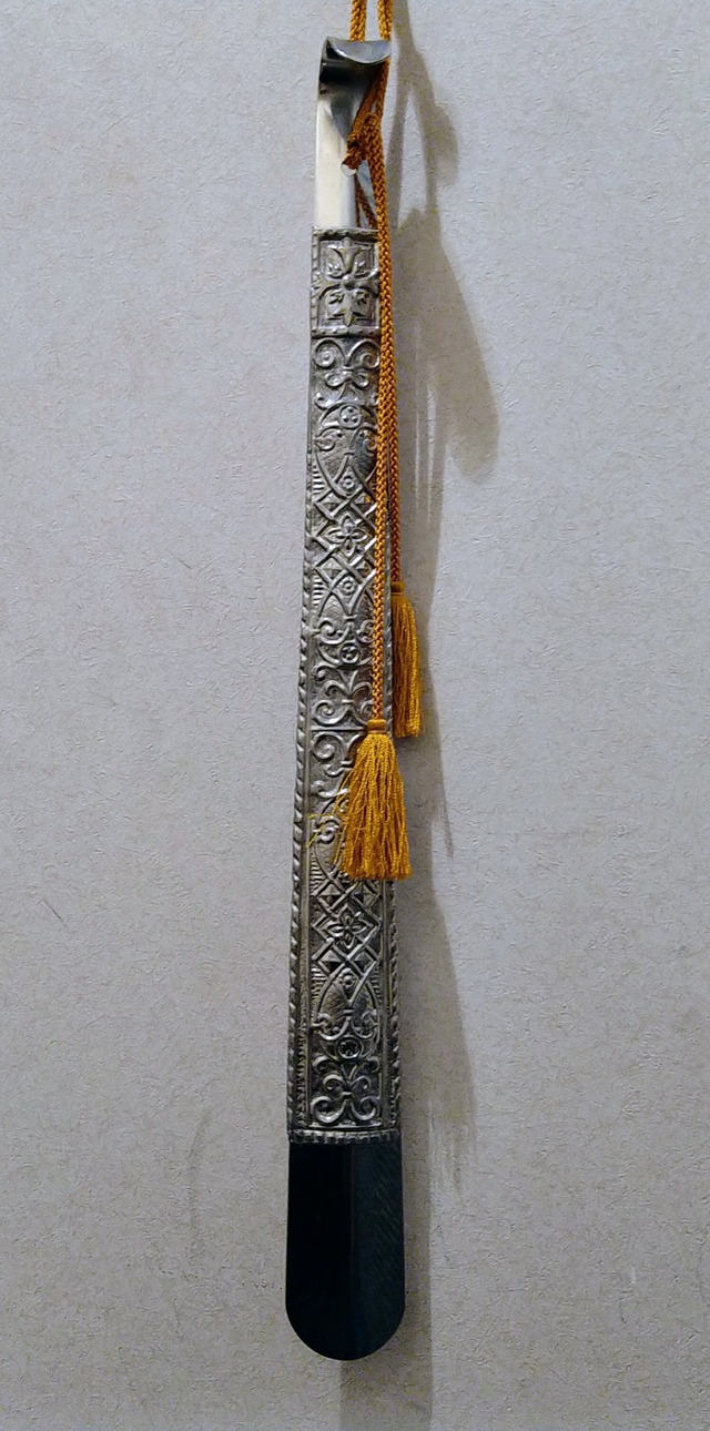中世の模様の靴ベラです。 靴ベラに錫の金属シートに模様をつけ貼り付けた物です。 素敵な中世の模様を見つけたので靴ベラにエンボッシングしました。お出かけの時にいつもと違う一日になれば良いなと思い作りました。 サイズ(cm):4x42 材質:ステンレス ※アンティーキング加工を施しているため白い粉が出ることがありますがティッシュ等で拭くと簡単に取れます。 It is a shoehorn with a medieval pattern. It is a pattern attached to a tin metal sheet on a shoehorn. I found a nice medieval pattern, so I embossed it on the shoehorn. I made it with the hope that it would be a different day than usual when I go out. Size (cm): 4x42 Material: stainless *Because it is antiqued, white powder may come out, but it can be easily removed by wiping with a tissue.