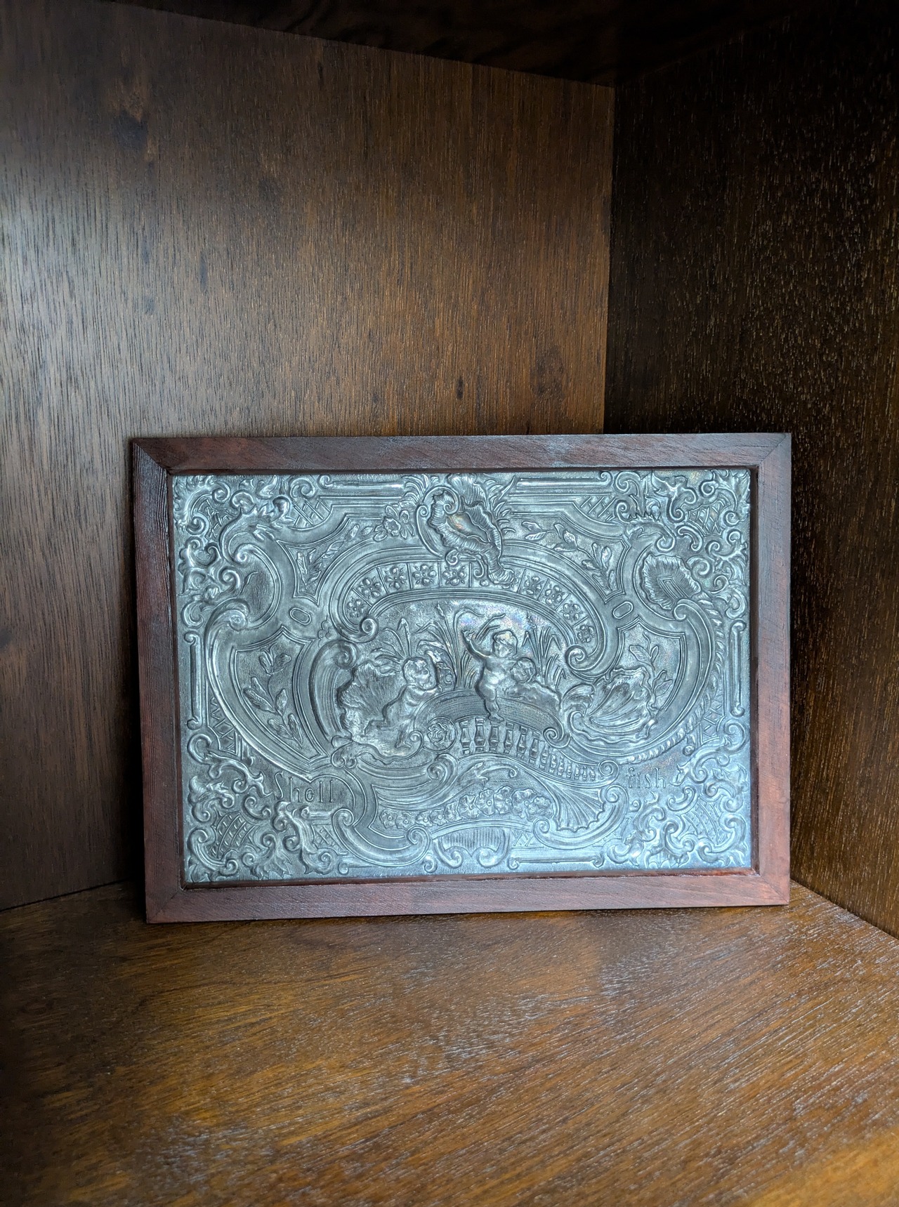 錫の金属シートに模様をつけ、木の額に入れた物です。
