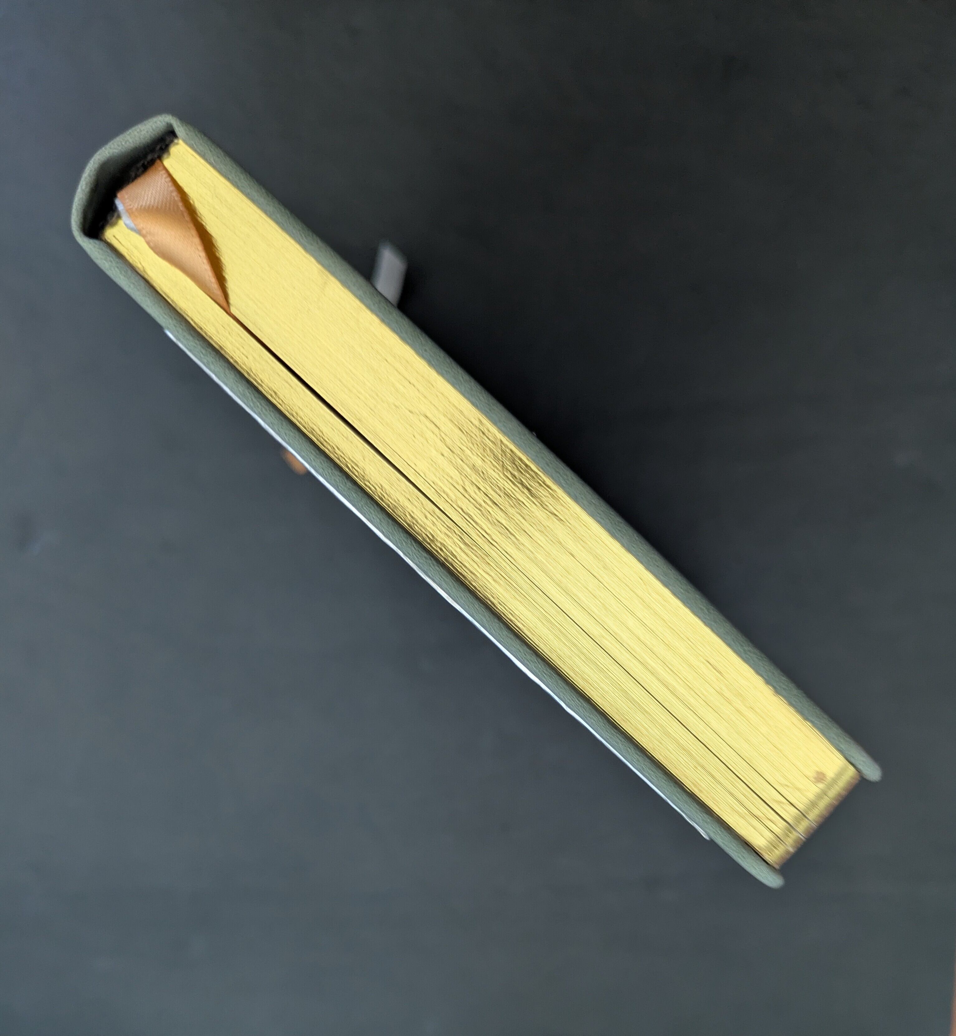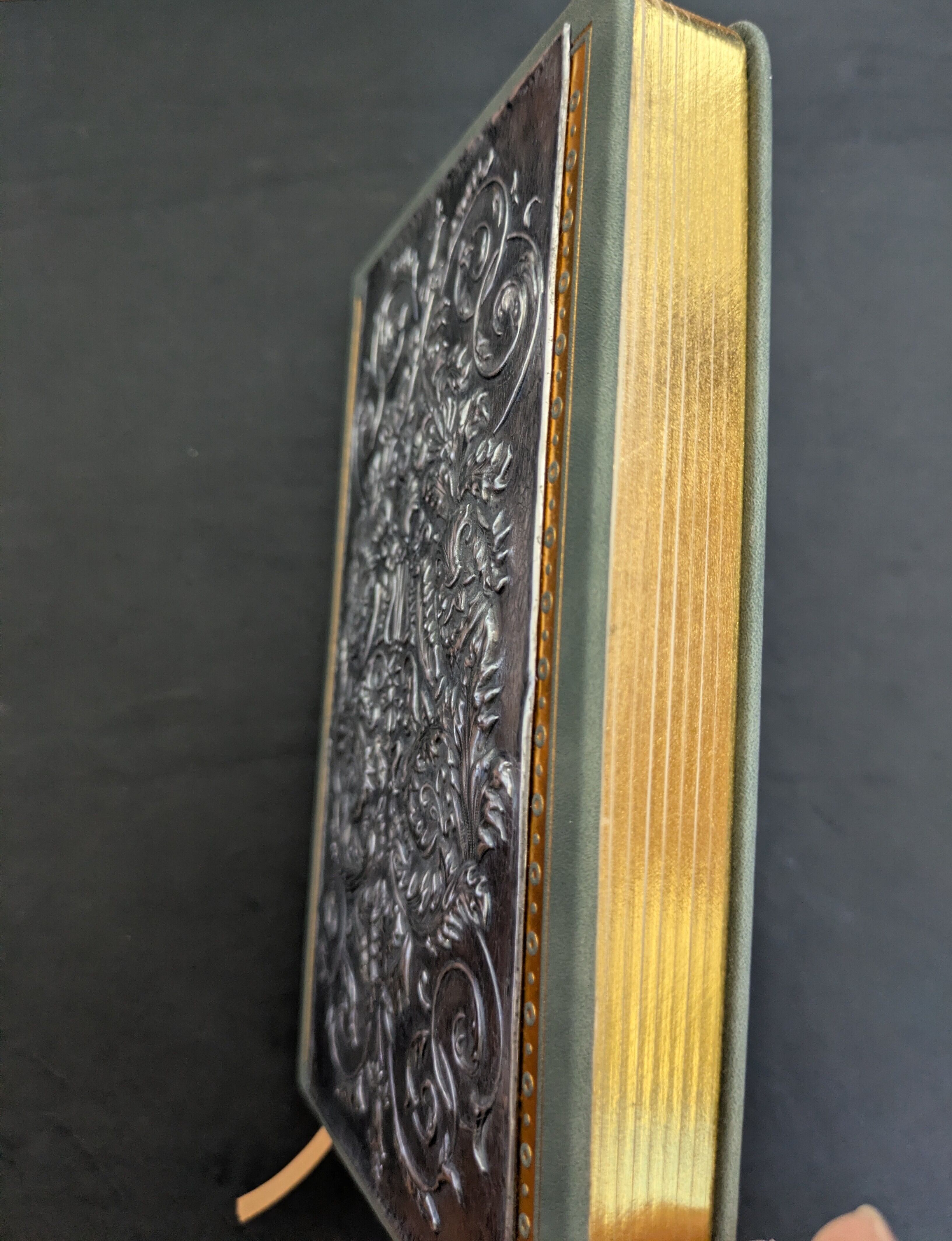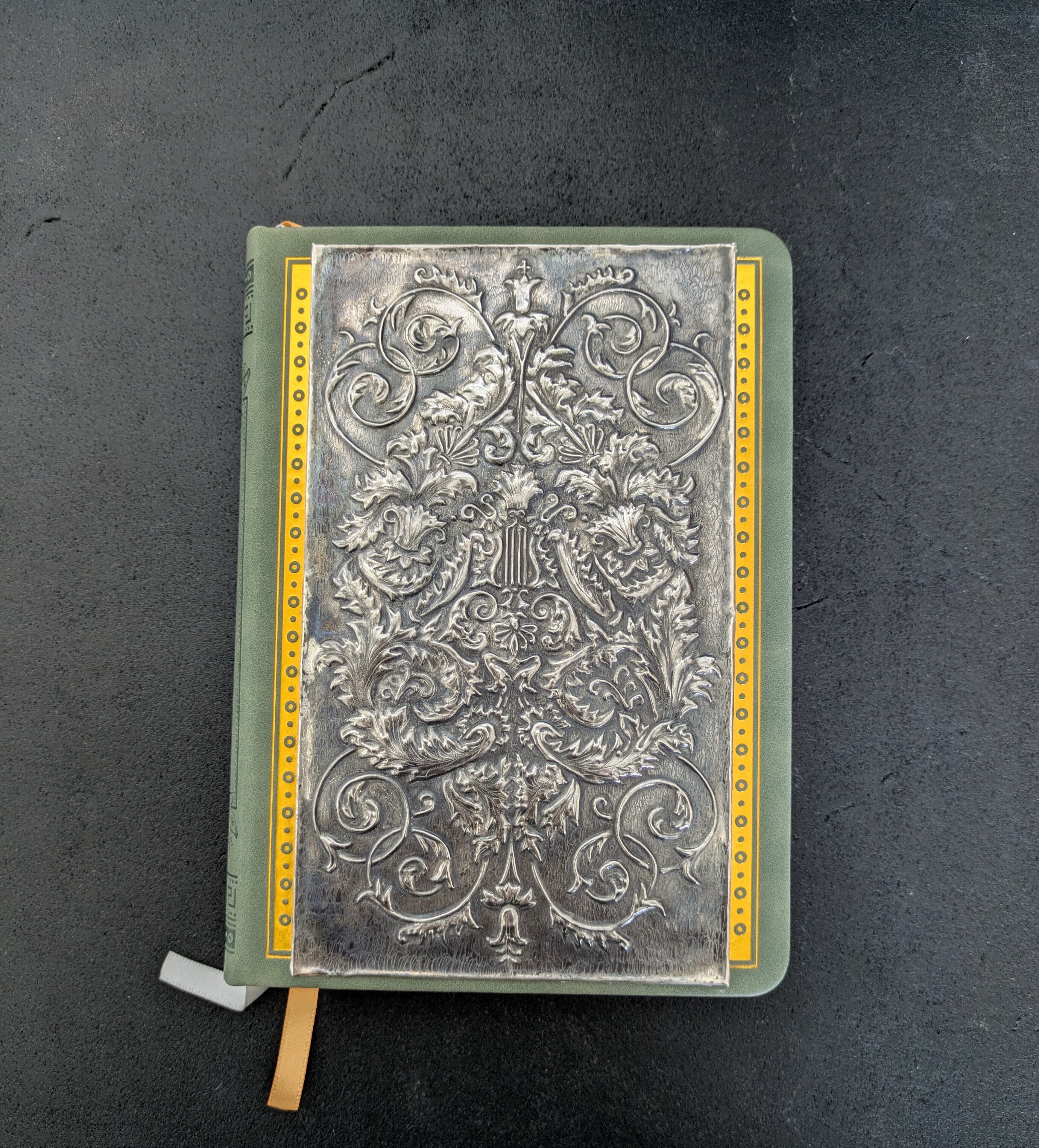 It is something where patterns were created on a tin metal sheet and then pasted into a notebook. When I transferred the design onto the metal sheet, I realized... it was a quite detailed pattern, so I was worried about whether it would turn out, but it is finished! The gold on the edge of the paper is gorgeous.